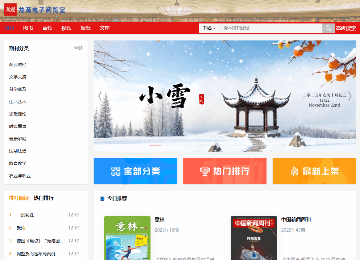 各种资源阅读排行,可以清楚了解关注最热的10种期刊、图书、报纸、音频或视频。